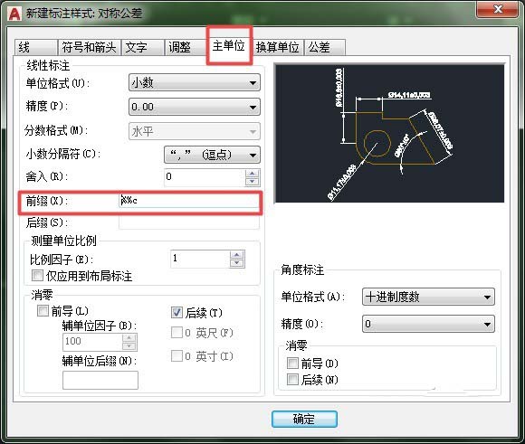 4、在“主单位”这一栏的“前缀”里填“%%c”。并按“确定”。