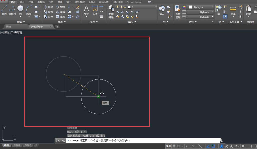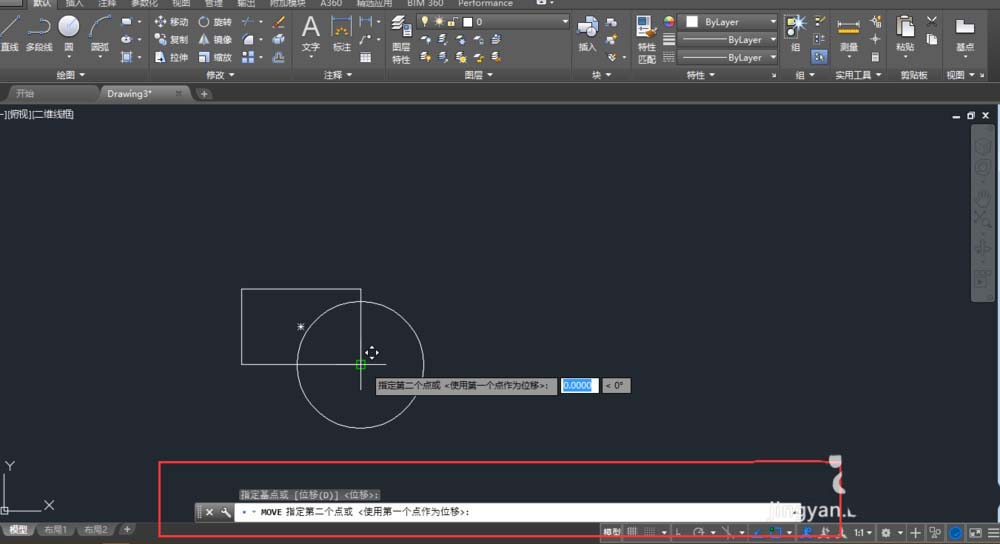 4、接下来在图纸上指定第二个点,也可输入与第一个点(基点)的距离和角度来确定第二个点(基点与移动对象位置是对应的)。
