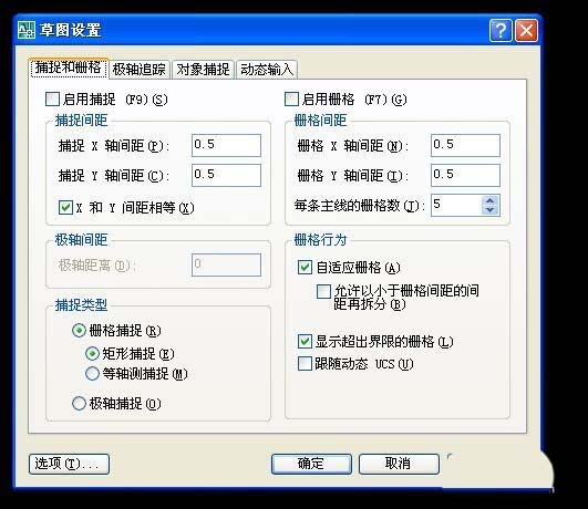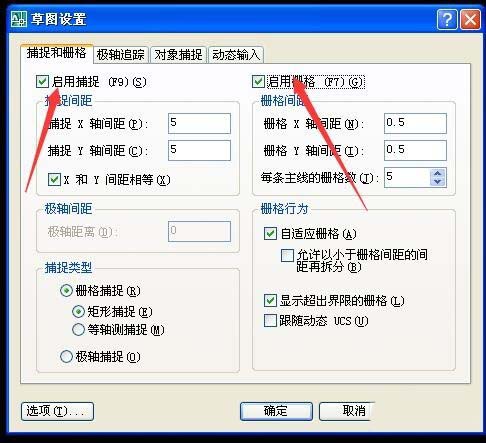 3、在“捕捉和栅格”选项,在启用捕捉和启用栅格选项前打对勾,点击确定,绘图区会出现很多点组成的区域。而这里的捕捉就是相对于栅格组成的距离或点的捕捉,根据个人习惯,一般启用栅格项都默认不选。