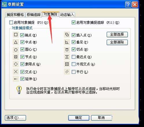 4、在“对象捕捉”选项,可以选择要捕捉的模式,比如我们在交点,端点前打对勾,那么我们绘制图形时,会自动捕捉到这些点,方便我们绘图。一般来说最近点,外观交点,平行点不常用,那么可以不用打钩,其他都选择。