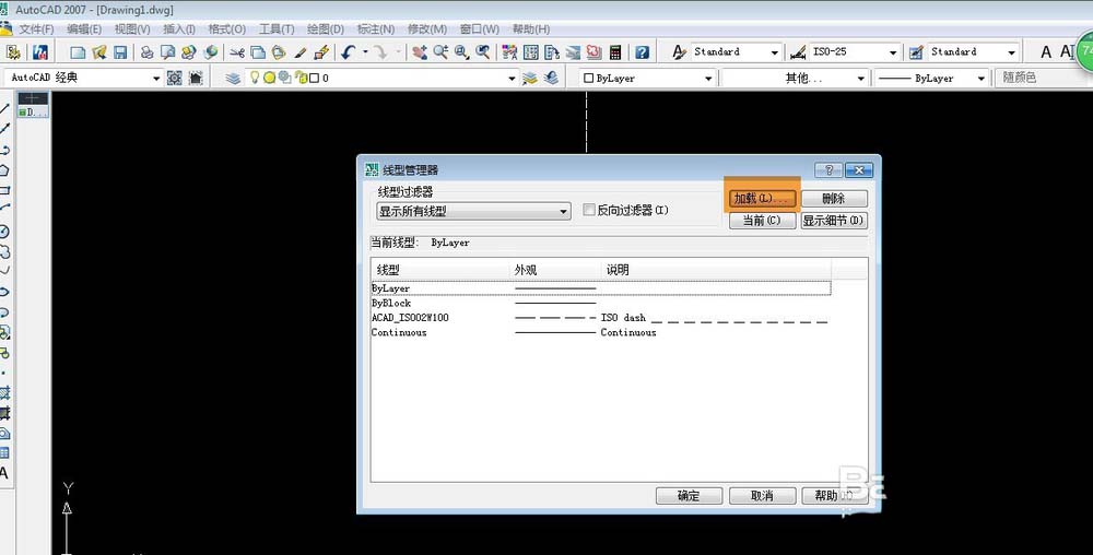 1、绘制辅助线,确定方向盘绘制的位置基点。具体操作为按下F8启动”正交模式“(这个在CAD下方的状态栏中可以看到,也可以直接点击进入正交模式)——在命令行输入“l”或者“pl”执行直线命令,也可以从工具栏中选择“直线”命令——绘制两条正交的直线。可以调整这两条直线为虚线。方法是选中直线后,点击工具栏中的”线型控制“选择合适的虚线。如果在”线型控制“下没有合适的虚线就需要加载线型。具体为选择上述下拉菜单中的“其他...”——弹出线型管理器的对话框——“加载”选择合适的线型,“确定”——之后就可以在“线型控制”的下拉菜单中找到你已经加载过的线型了。