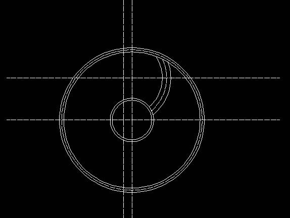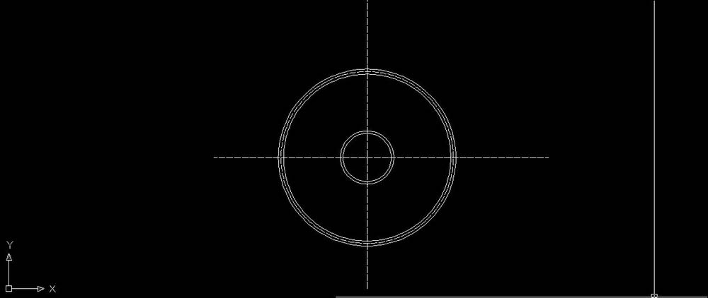 2、以合适的大小画圆。命令为"C"。然后将画的圆进行偏移,命令为“o”。具体“c”——选择辅助线交点为圆心——50为半径,空格,画圆成功——“o”——依据提示偏移距离输入6——选择上面画的圆为偏移命令的对象,空格。完成第一次偏移。依样画葫芦设置偏移距离为150,进行第二次偏移。之后再以该圆为内边6为偏移距离进行第三,第四次的偏移。最后和第一步一样的将倒数第二个圈变成虚线。