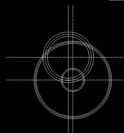 3、将辅助线向上向左偏移一定的距离。以偏移后的新的交点为圆心画圆。令该圆恰好经过第一步基线交点。具体“c”——选择圆心——手动捕捉基线的圆心,空格(或者回车。),ok完成。将该圆向左向右分别偏移10单位。改中间那个圆线型为虚线。