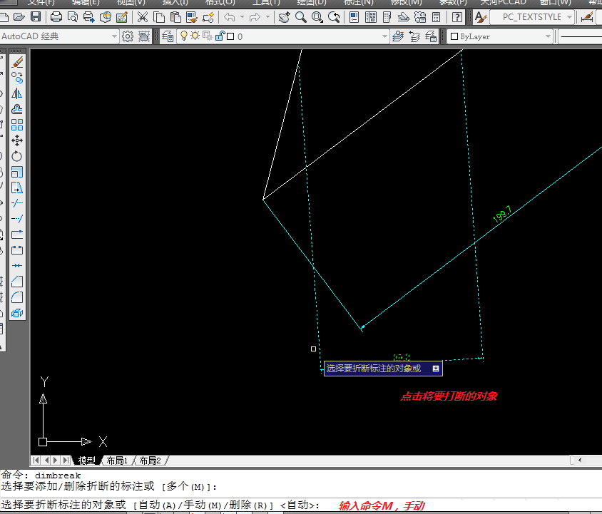 2、选择将要打断的标注线,单击选择;