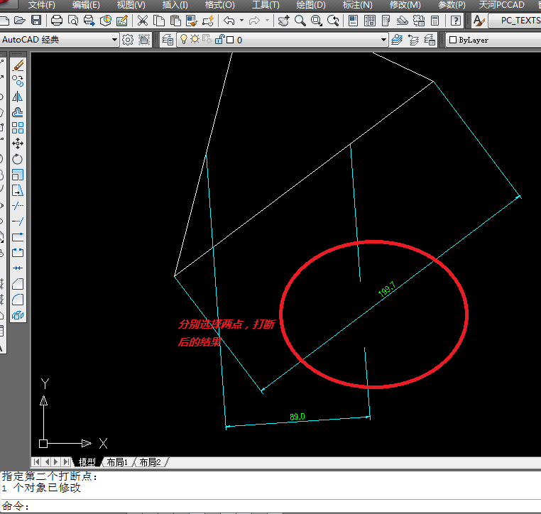 3、先后选择两点来确认打断范围,打断完成,如图: