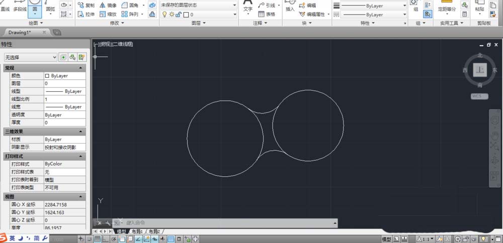 1、打开CAD软件,如图画两个相交圆,点击圆角