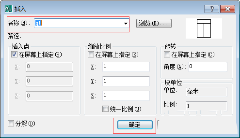5、插入块窗口,点击浏览你写入的块,插入点选为在屏幕上指定,如果你需要块旋转在旋转角度输入角度。点击确定。