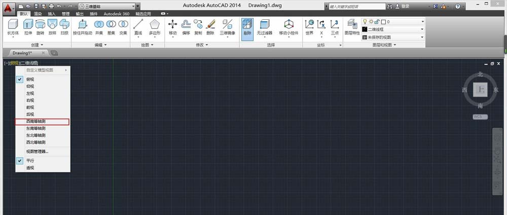 2、击俯视两个字,会弹出如下界面,然后我们选择西南等轴测作为我们的视图。(也可根据需要选择其他立体视图)