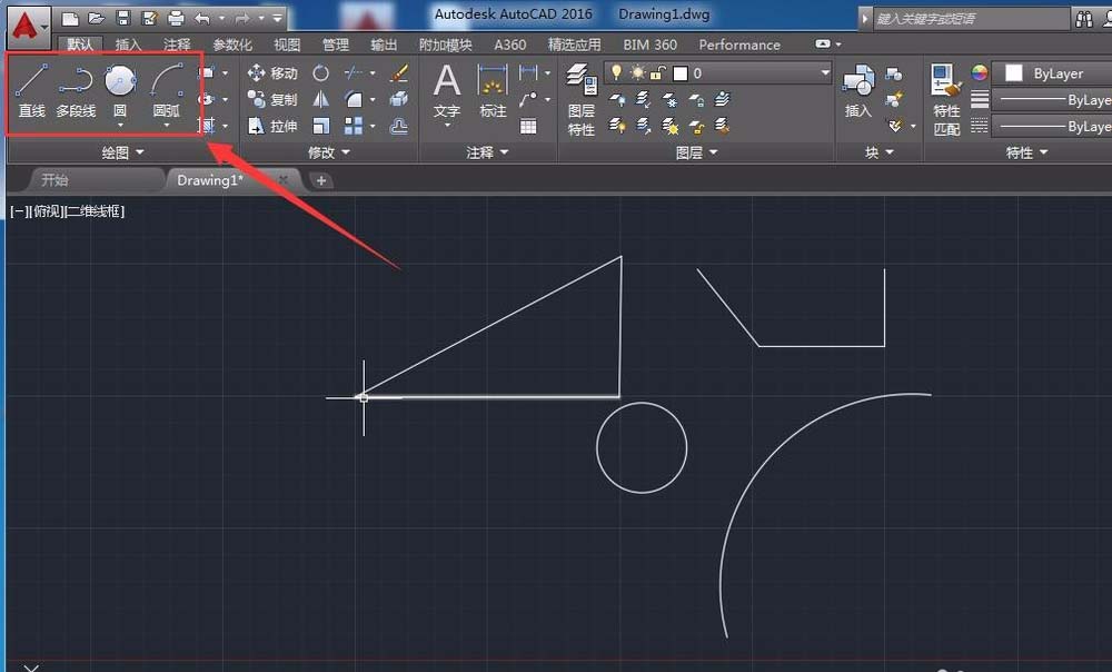 4、在默认工具栏中可以看到常用的几种工具,包括直线、多段线、圆、圆弧等。在相应的图标上点击一下,然后在绘图区域进行绘图即可。