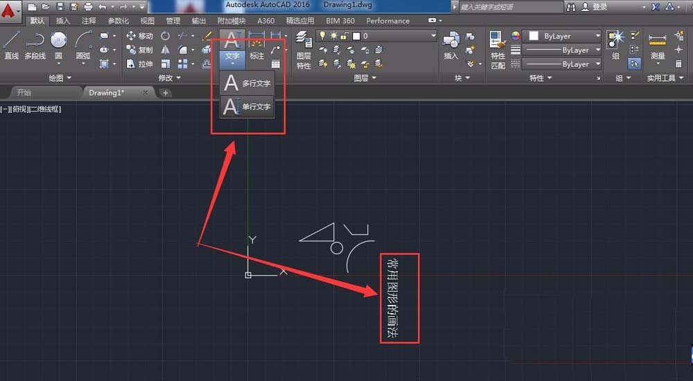 5、在默认工具栏的中部位置可以看到一个A标志,点击一下可以看到“多行文字”和“单行文字”两个选项。点击之后在绘图区域直接输入文字即可。