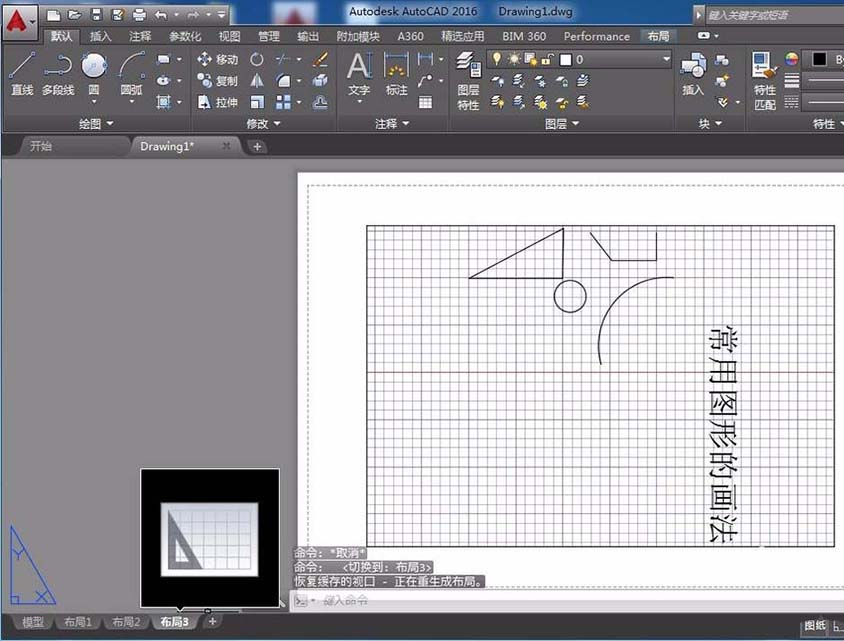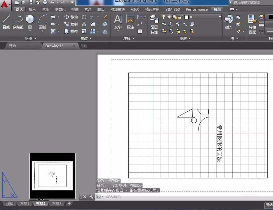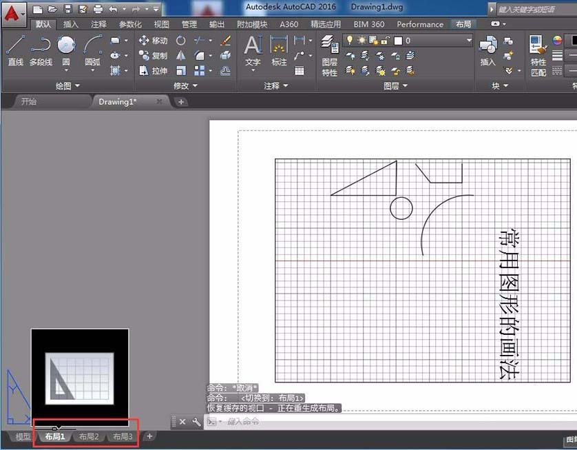 6、点击左下角的“布局1”、“布局2”,此功能类似于EXCEL中的SHEET工作表,只不过每一个布局的背景不同而已。