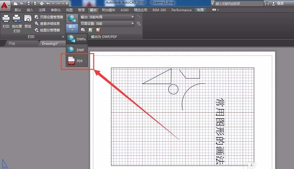 8、如果要保存文件,可以使用快捷方式CTRL和O键,默认保存格式为dwg格式。如果想保存为PDF格式,需要在工具栏点击“输出”,可以看到PDF选项,直接点击即可。