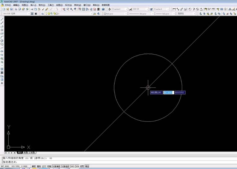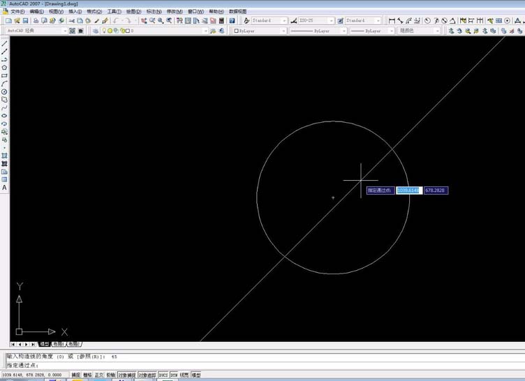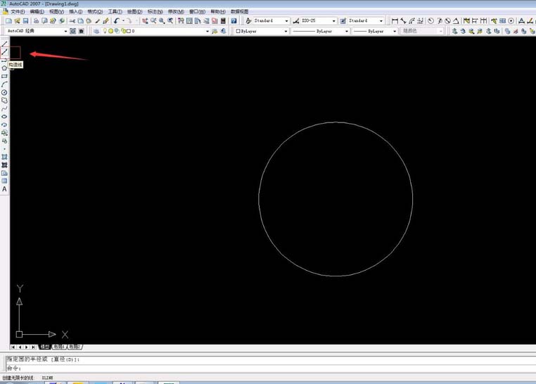 4、捕捉圆心并点击,绘制出参考线。