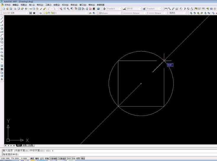 8、鼠标点击圆和构造线交点处,这样正交内接正方形就画好了。