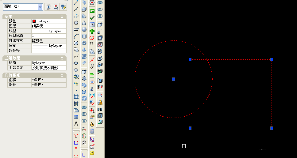 7、面域也可以进行交集、差集、并集功能。点击交集,圈选两个面域,回车,结果就是两个面域相交部分。