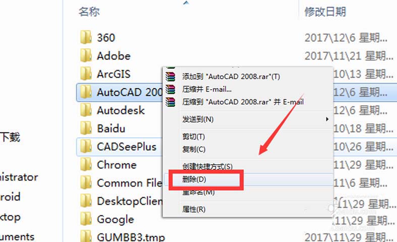2、待找到cad2008安装程序之后,点击键盘上的“delete”键,将安装程序进行删除,注意一个也不能留,如图