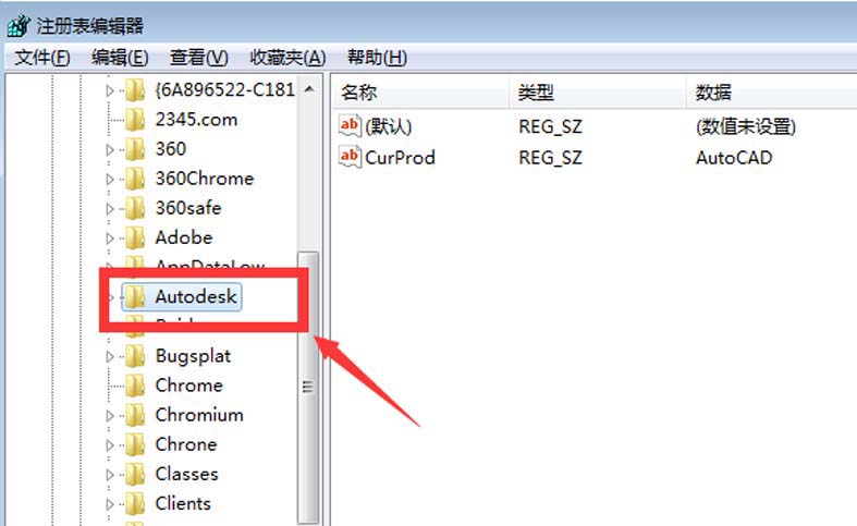 4、待进入注册表之后,在注册表按照HKEY_LOCAL_user/software/autodesk找到Autodesk文件,将其删除,然后按住键盘上的CTRL+f组合键,分别找到以7d2f开头的文件,然后并将这些文件删除即可彻底清除cad2008软件,如图