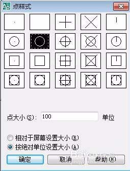 1、使用点前,先要设置点的样式,在点样式对话框中设置点的样式和大小。这个对话框可以通过格式菜单>点样式打开,也可以使用命令ddptype来打开。