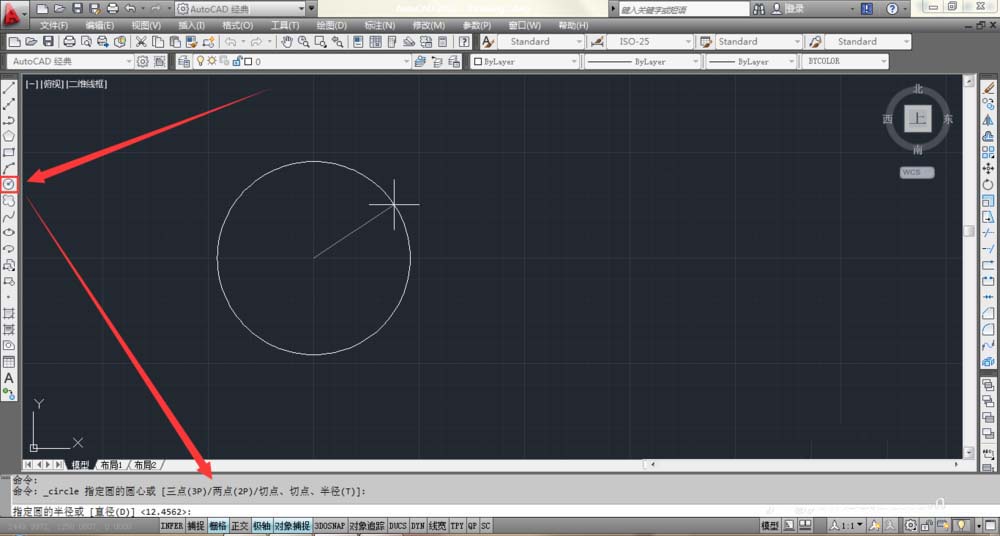 1、点击右边工具栏的圆,再根据你所要画的扇形的半径输入到下方命令栏处,画好一个圆。