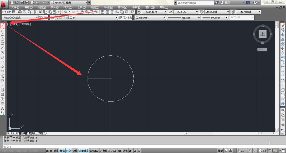 2、点击右边工具栏的直线,并捕捉到圆的圆心以及与圆的交点,两者相连。