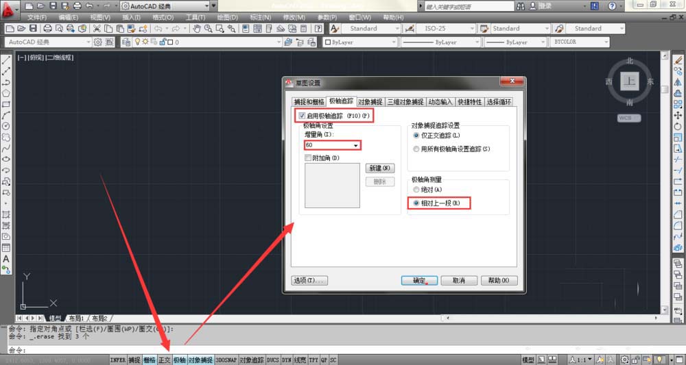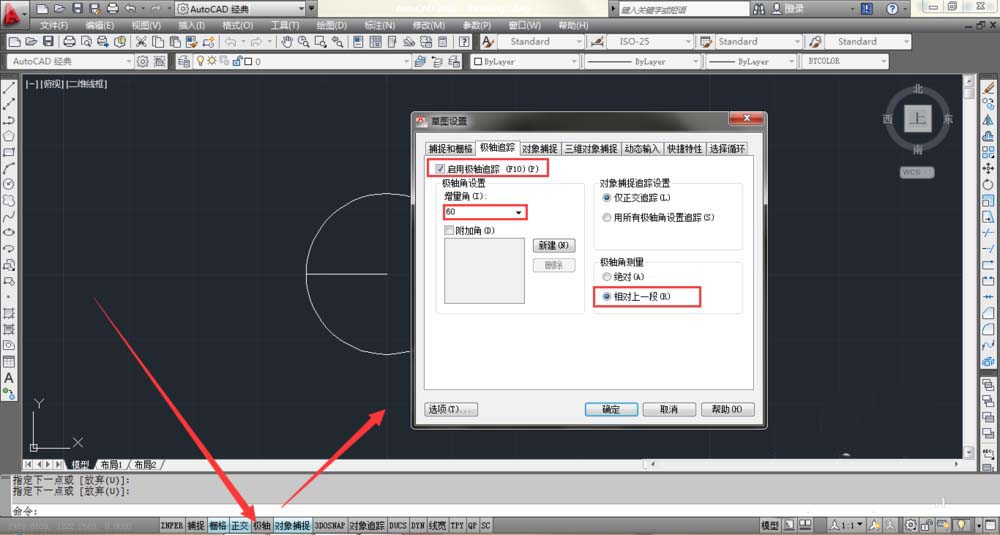 3、假设你所要画的扇形角度为60度。把鼠标置于底部功能栏右键设置,启用极轴追踪,增量角改为60度,极轴角测量选为相对上一段。