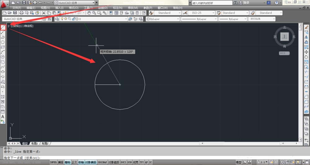 4、点击右边工具栏直线,捕捉圆心以及并通过极轴追踪确认一条与上一条线相隔60度的线。