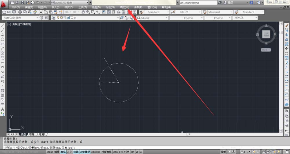 5、点击上面的修改,找到并点击修剪,按住左键把整个图形囊括在内后,点击右键