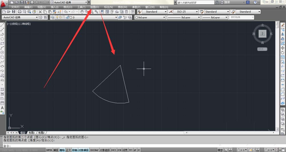 3、点击上方绘图,找到圆弧,选择起点圆心端点,然后一一对着图形点击。于是扇形就出来了。