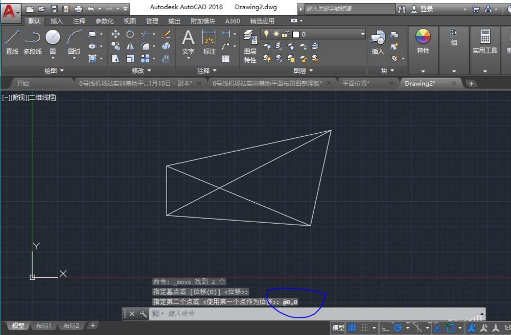 3、输入原点坐标(0,0),在原版就可以移到原点了。而CAD2017没有任务移动。且下方提示显示(@0,0)表示输入的是相对坐标,所以没有任务移动。