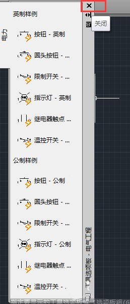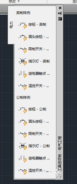 4、这时候,系统会自动弹出【电气工程】工具选项面板,我们可以从上面选择我们需要的工具了,其他的工具选项面板也是同样调出的。