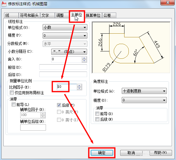 4、在cad修改标注样式中选择主单位,修改比例因子,然后确定。