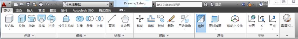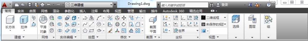 该工作空间与 ''三维基础” 相似,但其功能中增添了“网格”和“曲面” 建模。在该工作空间中,也可运用二维命令来创建三维模型,如图所示。