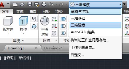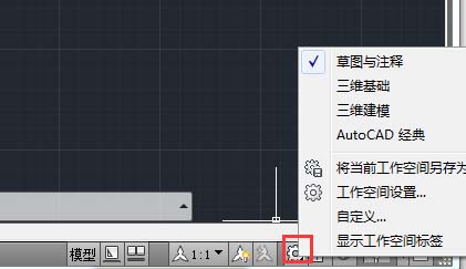 在实际绘图时,用户可根据绘图要求对工作空间进行切换操作。单击快速访问工具栏中的“工作空间” 按钮,在展开的列表中进择所需空间选项,即可完成工作空间的切换, 如图所示。