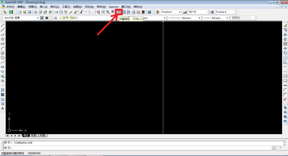 打开AutoCAD,打开工具栏中的“对象特性”按钮,或者按“Ctrl+1”快捷键,打开特性
