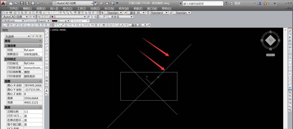 3、然后以将两条中心线,以交接点,旋转(快捷键RO)45°。如下图
