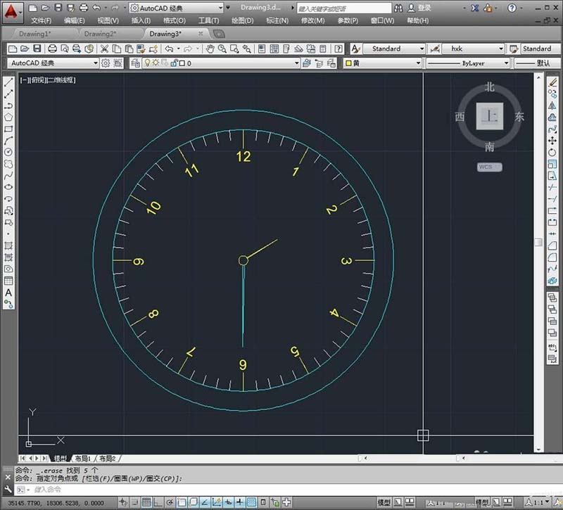 13、最后,我们在圆中画指针轴,使用命令“c”画一个小圆,再用命令“l”画两条直线来绘制指针。这样我们的手表表盘就完成了。
