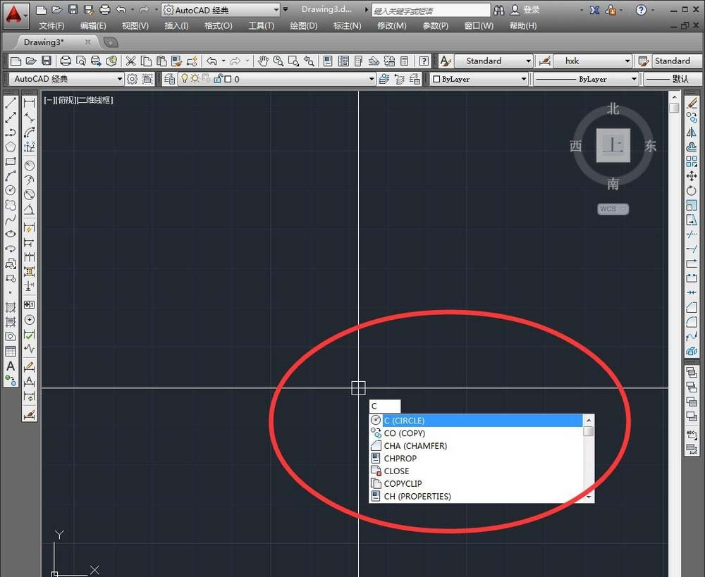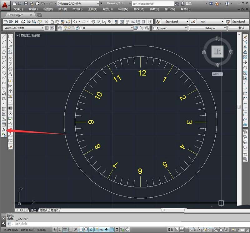 1、表盘的绘制思路是首先绘制两个同心圆做大体,然后利用阵列作出刻度盘,添上数字,最后使用选择做出时针分针。现在我们输入命令“c”来绘制同心圆。