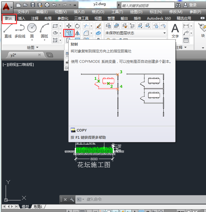 3、在菜单栏依次选择【默认】》【修改】》【复制】选项,根据命令行提示,选择所需复制的图形,并制定复制基点,然后移至新位置。