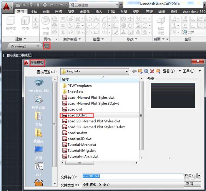 1、首先通过AutoCAD2014的【选择样板】载入三维基础样板,acad3D.dwt。