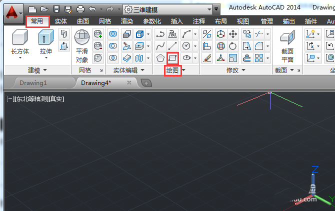 2、接着通过菜单栏【常用】》【绘图】》【矩形】绘制一个矩形。
