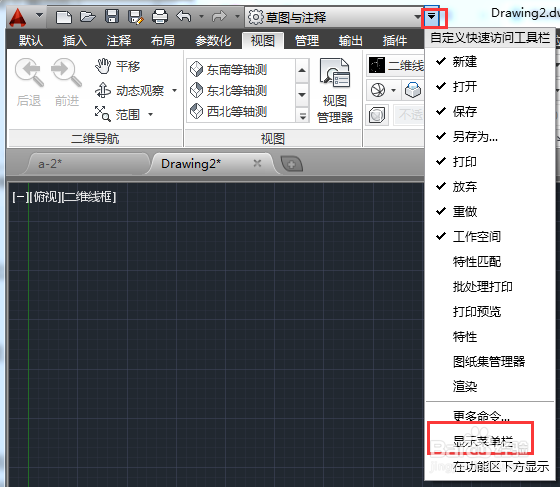 1、首先点击【草图与注释】后面的一个下拉按钮,选择【显示菜单栏】。
