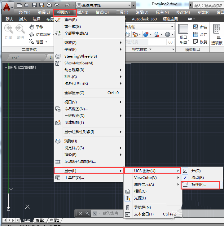 2、在菜单栏中依次选择【视图】》【显示】》UCS图标》【特性】选项。