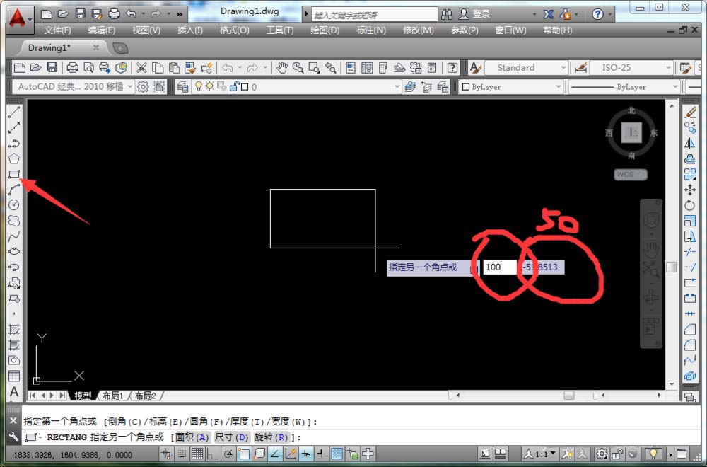 1、先用矩形工具绘制一个长100,宽50的矩形。