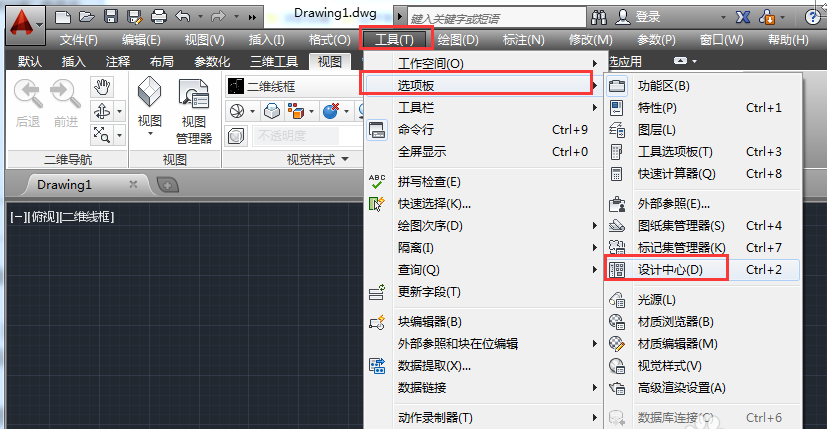 1、在菜单栏中依次选择【工具】》【选项板】》【设计中心】选项,打开【设计中心】对话框。