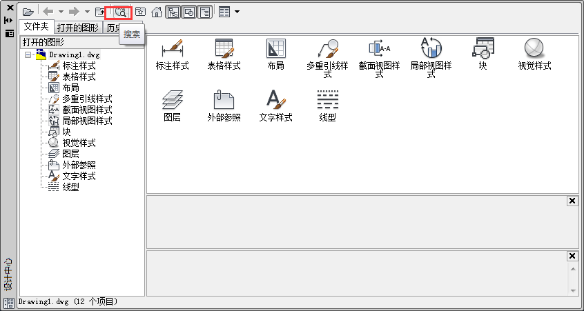 2、在弹出的【设计中心】菜单栏中选中【搜索】按钮。