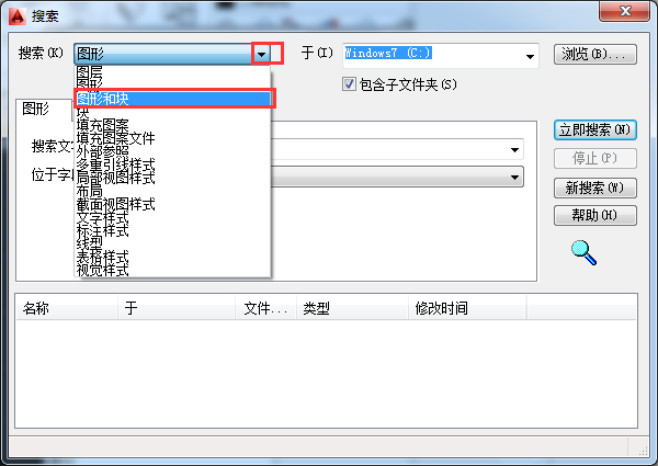 3、此时会弹出【搜索】对话框,接着单击【搜索】下拉按钮,选择搜索类型,如“图形和块”。