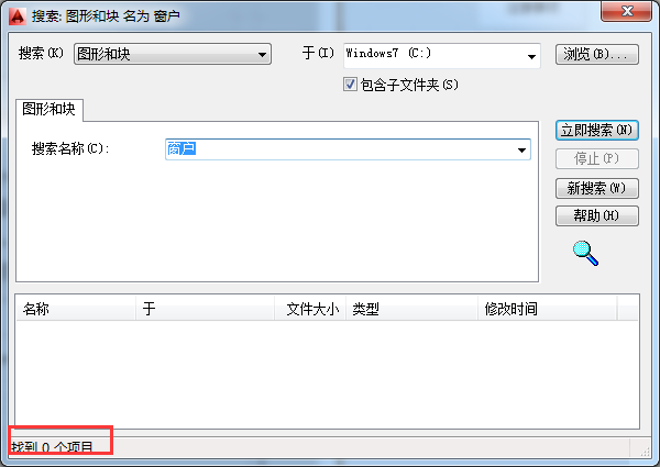 6、稍等一会后搜索会结束,如果没有发现在会在【搜索】对话框的左下角显示“找到0个项目”。
