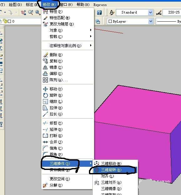 2、选择修改--三维操作--三维旋转功能选项,鼠标左键点开。