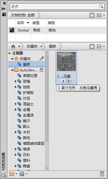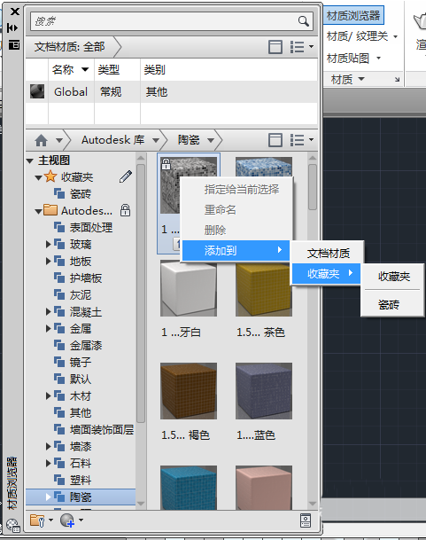 4、在【文档材质】列表中,选择材质贴图选项,单击鼠标右键,在打开的快捷菜单中,选择【添加到》收藏夹】选项,并在其级联菜单中选择刚创建的类别。