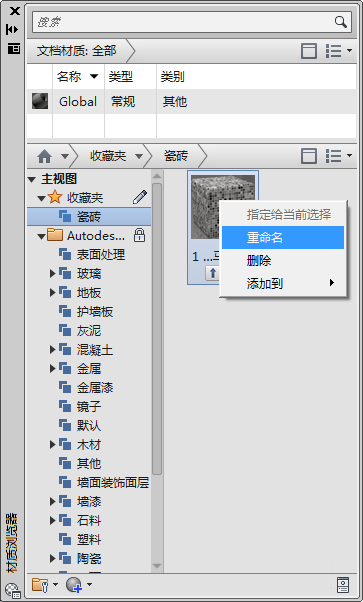 6、在该材质库中,右击添加的材质贴图,在快捷菜单中【重命名】选项,即可重命名该材质,若想删除该材质,右键菜单选择【删除】选项即可。